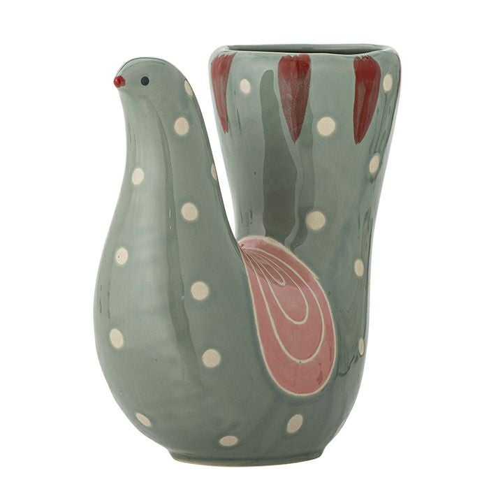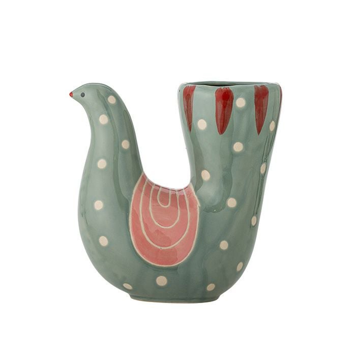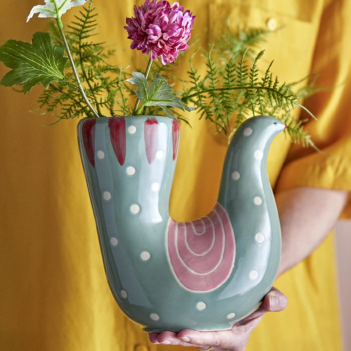 柔らかなフォルムと手描きの模様が、どこか温かみを感じさせる鳥の形のフラワーベース。