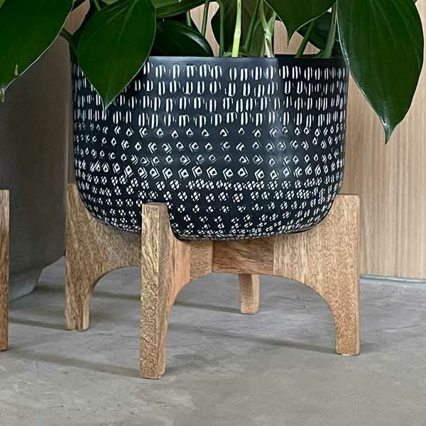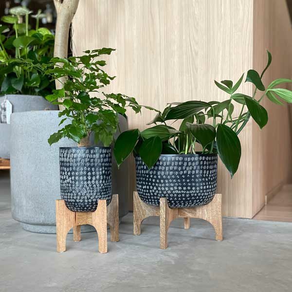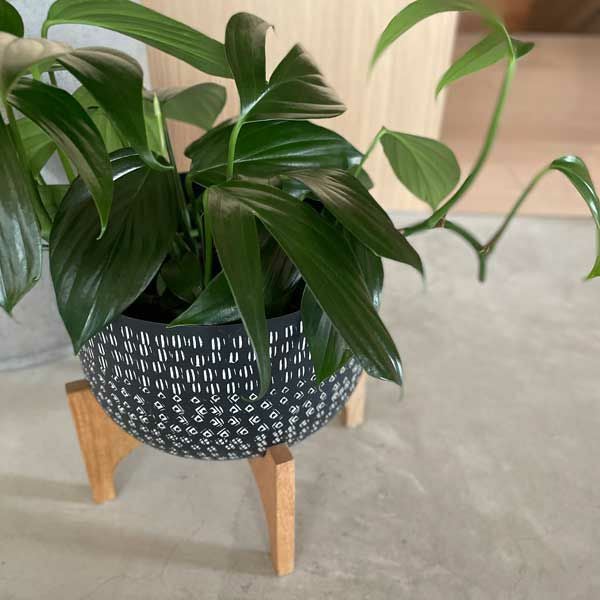 鉢カバーとスタンドの対照的なカラーや素材感がモダンな空間を演出してくれます。