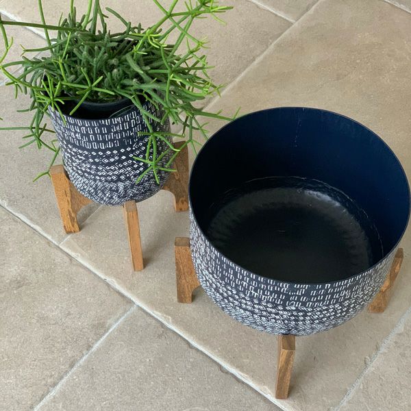 特徴的なデザインが存在感抜群の鉢カバーとスタンドのセット。