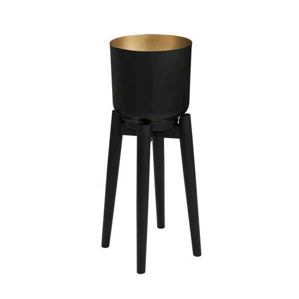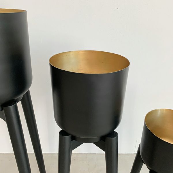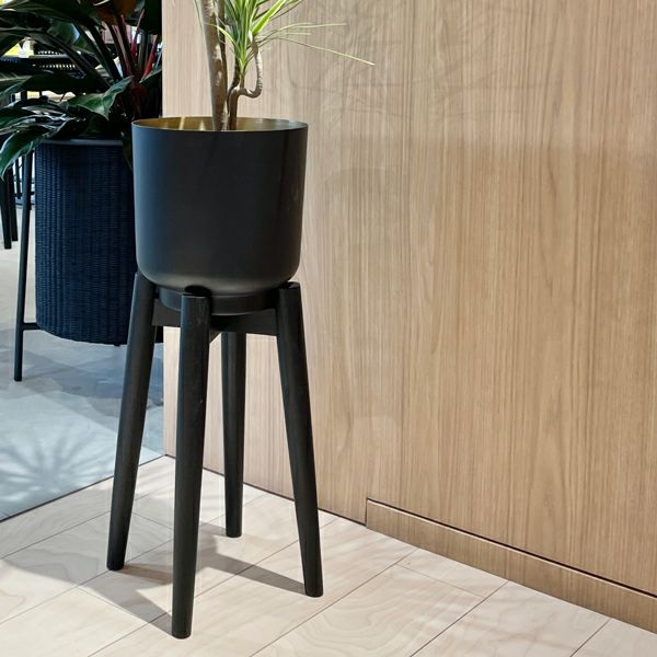 木の土台とブラックカラーの鉢カバーがセットになったプランタースタンド。