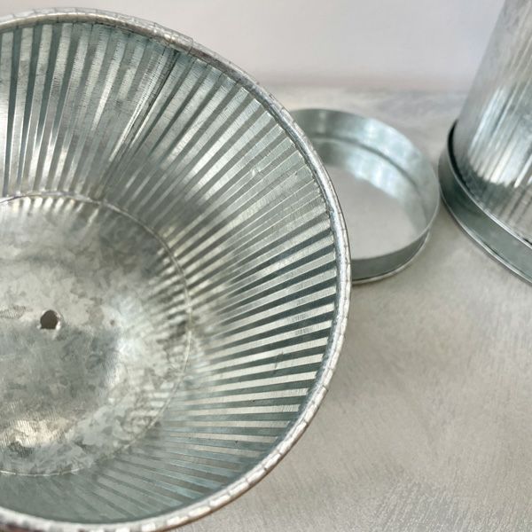 ブリキ製のソーサー付きのポット。どんなインテリアにも合わせやすく、グリーンがよく映えます。