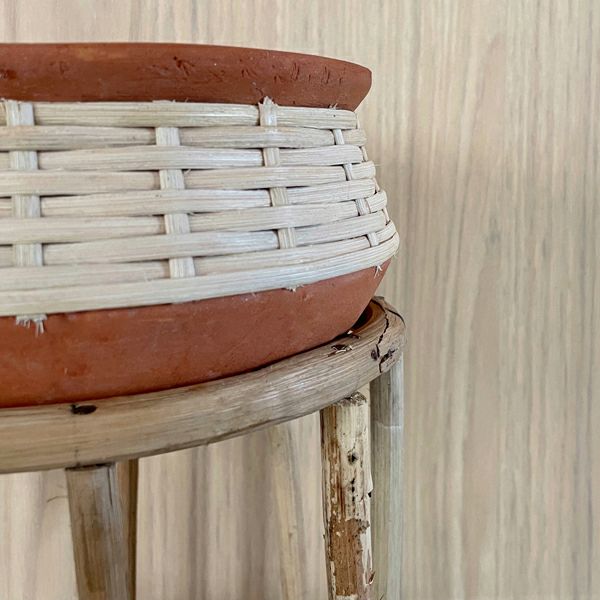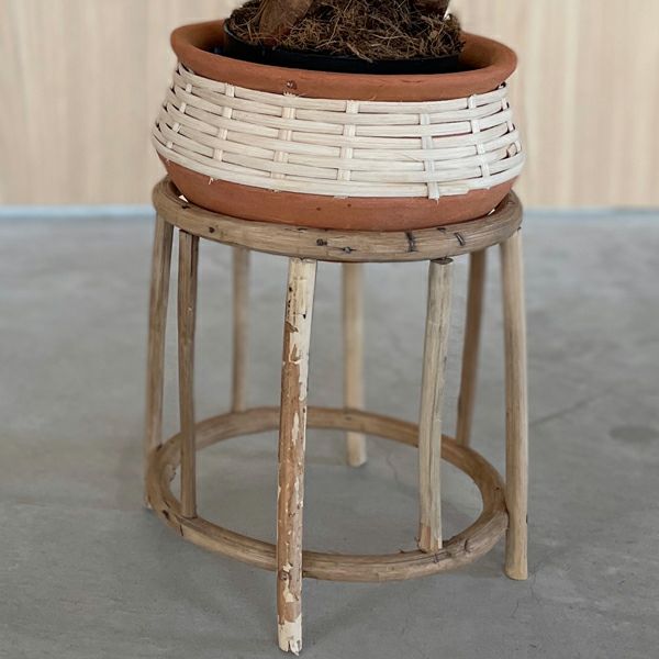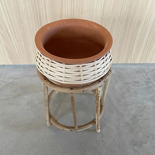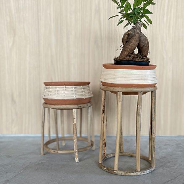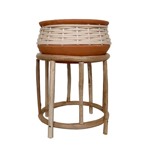 テラコッタ素材のポットと木製ポットスタンドのセット。