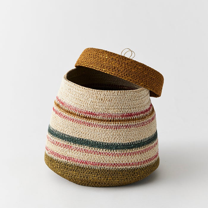 ボーダーのデザインがアクセントのシーグラスで作られたバスケット。