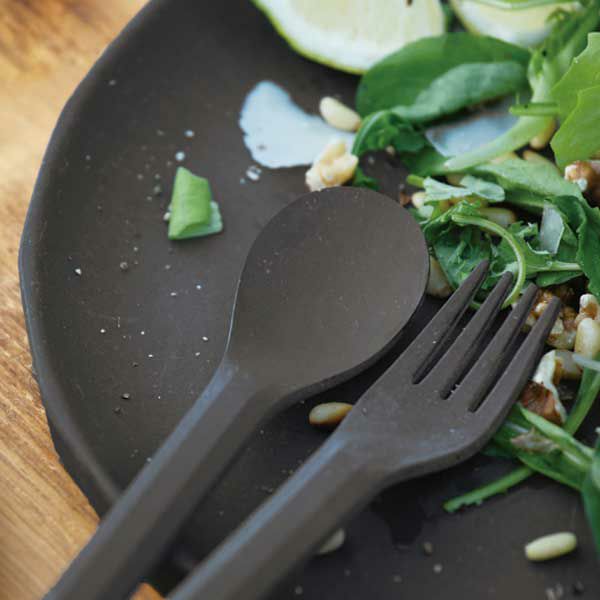 樹脂に竹の繊維を混ぜた素材で作られたフォーク。プラスチックや陶器とは違う、マットで柔らかな肌触りの良い質感です。自然の情景になじむ上品なカラーで、衝撃に強く軽いためアウトドアで使うのにも最適です。