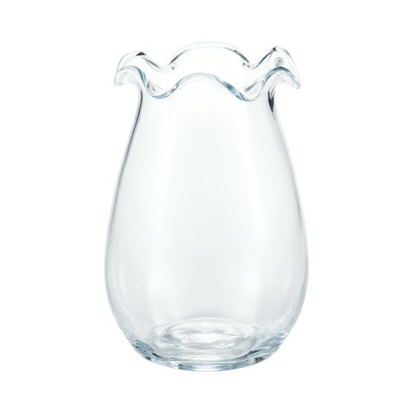 花瓶の縁の曲線と透明のガラスのデザインが特徴で、花を活けたときに、水の反射も楽しめます。金魚鉢のような口がすぼまった特徴的な形。すぼみの部分がしっかりと支えてくれるので、すぼんだ部分の上に自然とふんわり・こんもりと花をあしらうことができ、初心者にもおすすめの形状です。ブーケはもちろん、数本のグリーンでも素敵です。夏は白砂やヒトデ、秋は松ぼっくりや木の実など、季節を感じさせるアイテムを入れて飾るのも素敵です。サイズ違いを並べてのディスプレイもおすすめです。