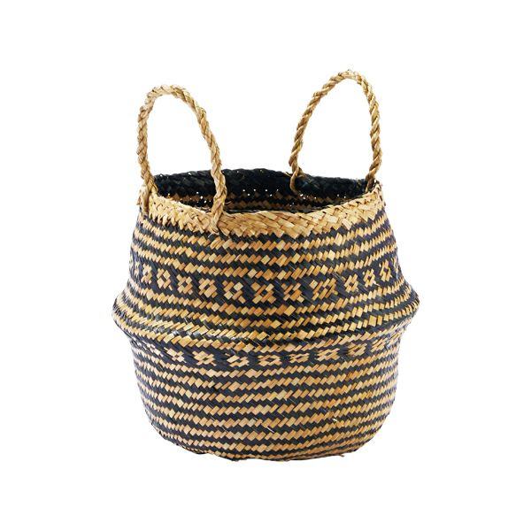 モノトーン柄の鈴のようなユニークな形のバスケット。そのままお部屋におくだけでもインテリアのアクセントになります。柔らかくしなりのあるシーグラスを編みこんで作られたバスケットはとても軽く、床に置いても傷つく心配はありません。洗濯物やラグ、本などの生活雑貨を入れたり、子どものおもちゃ入れにしたり。置いてあるバスケットに入れるだけなので簡単に片付けられて、オシャレに収納できます。柔らかい素材を活かし、上半分を折り返せば、浅いバスケットのようにもお使いいただけます。サッと取り出して履きたいスリッパなどを入れたり、お客さまが来た時の荷物入れにもなります。さらに折り返すことにより重ねることが出来るので使わないときでも邪魔にならないのが嬉しいポイントです。