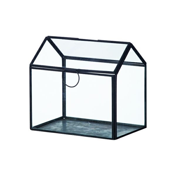 ガラスを使ったお家のかたちのジュエリーボックス。指輪やネックレス、イヤリングを見せて収納。多肉植物を植えたりエアプランツを飾ったりしても素敵です。