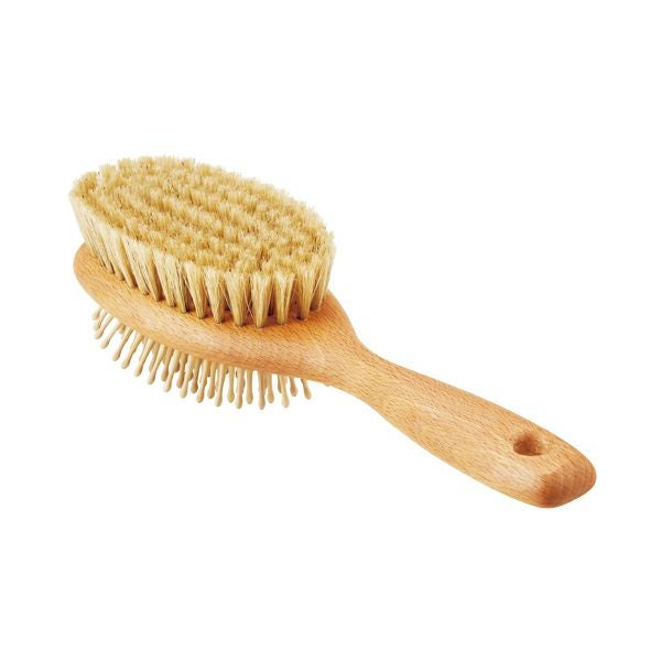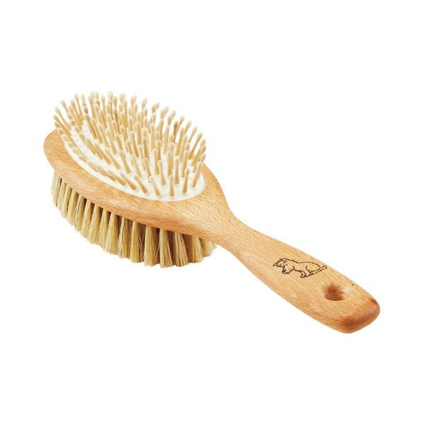 天然毛とウッドピンを使用したコンビドッグブラシです。ラバークッションに植毛されたウッドピンはマッサージや毛梳きに。ソフトな白豚毛ブラシはブラッシング時に静電気が起き難く、ワンちゃんの毛艶をピカピカにします。ラバークッションには一箇所だけ小さな穴が開いていますが、これはクッション性を高める為の空気穴です。