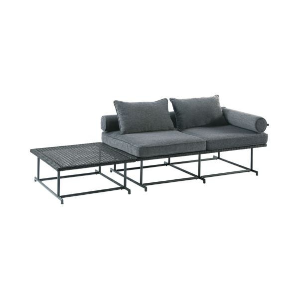 籠目文様に編み上げた人工ラタンのサイドテーブル付きのダブルソファ。サイドテーブルを好きな位置に移動できます。