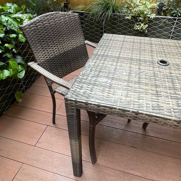 人工ラタンをあしらったスタッキングチェア。ゆったり寛げるようにラタンの質感と座面の広さにこだわりました。人工ラタンは、手触りも滑らかで、お手入れも簡単です。天候や紫外線などの影響も受けにくく、長期に渡りご利用いただけます。落ち着いたブラウン系のカラーリングです。広々と落ち着きのある作りのサハラ・ダイニングテーブルとセットでどうぞ。いつものテラスがアジアのリゾートに早変わり。
