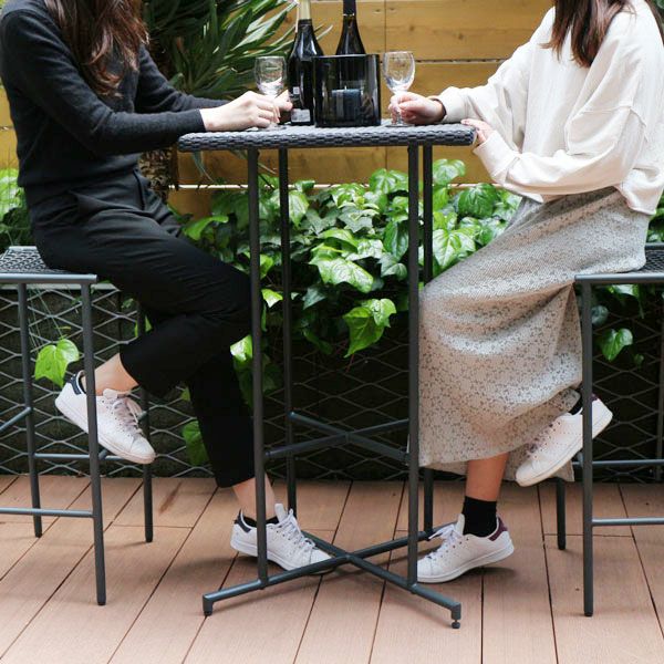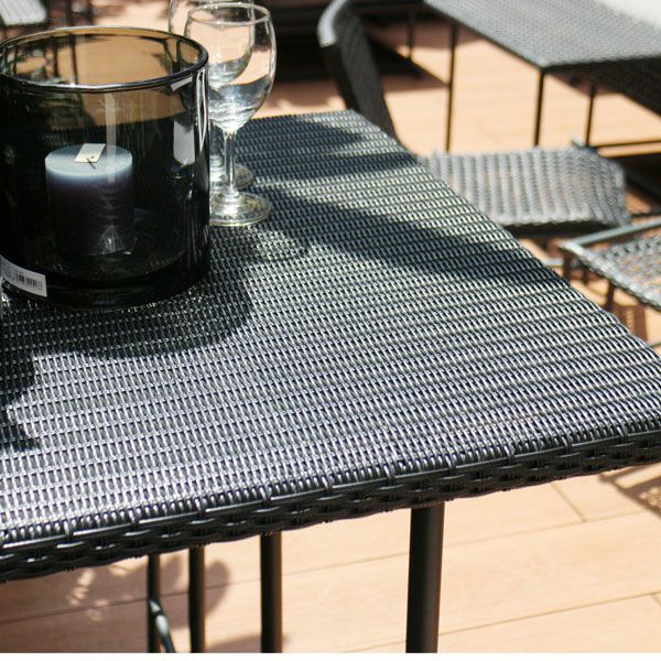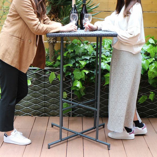 コンパクトなベランダにも設置できる60cm四方のハイテーブル。ハイスツールとセットで使うテーブルです。