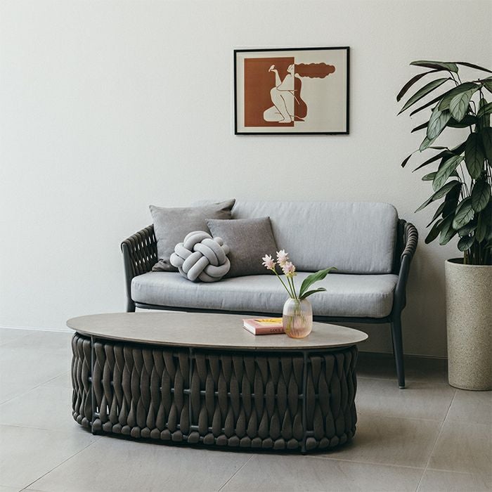 フレーム、クッション、ロープ、テーブル天板をグレーで統一することで、落ち着きのある洗練された印象が特徴のアウトドアファニチャーです。